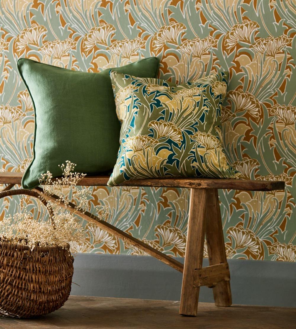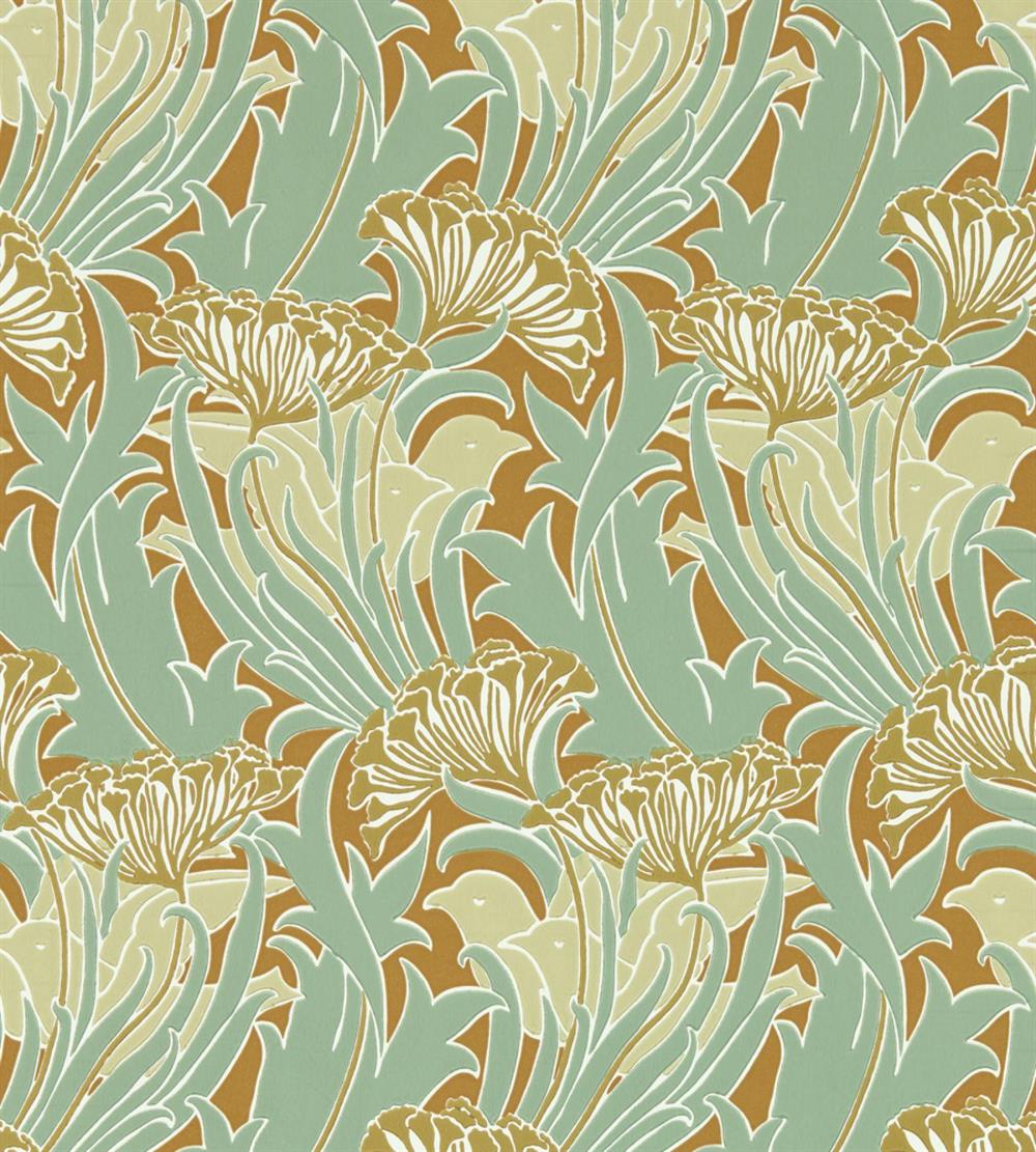 From around 1895 C.F.A. Voysey gives us Laceflower. Swaying in an imagined wind Voysey's characteristic birds chirp among the stems and flowerheads. The gentle movement in the pattern is emphasised by simple saturated colour stories with Tobacco & Pistachio offering a sophisticated retro feeling directly taken from the original document we hold in our archive.