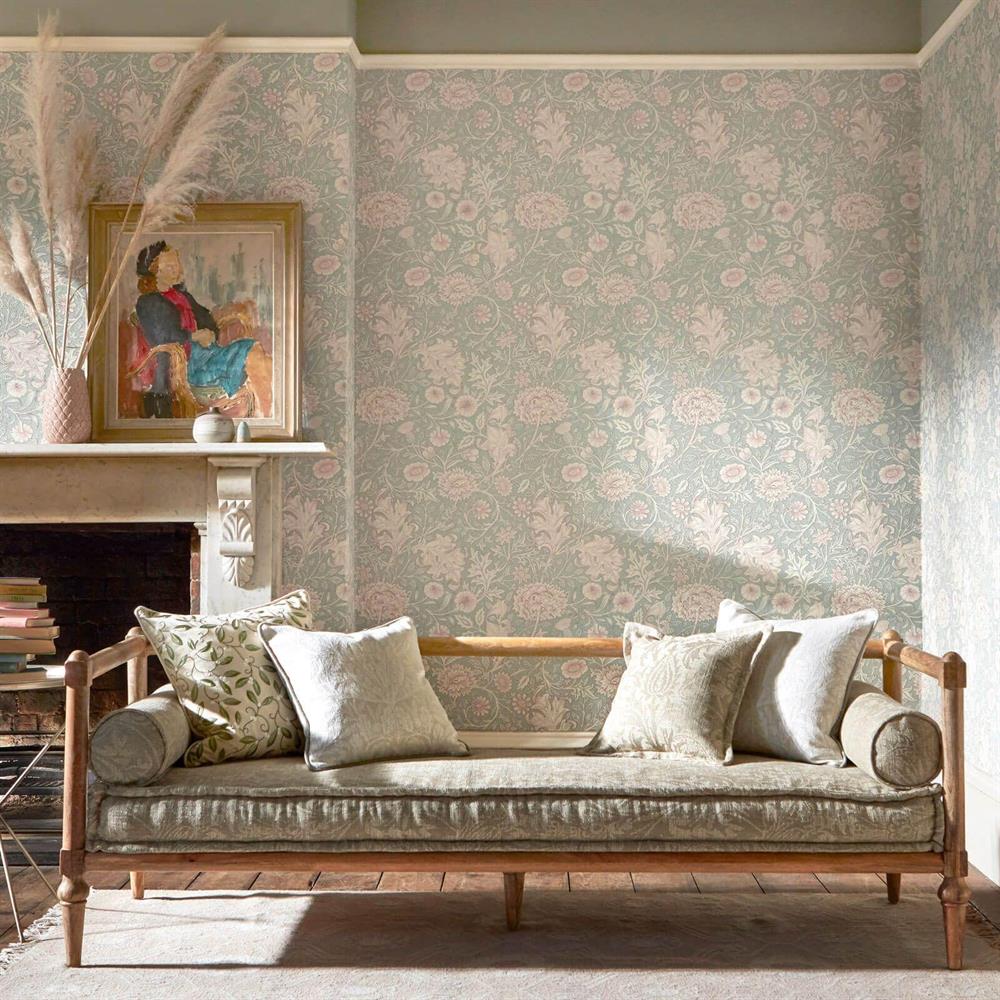 Scrolling acanthus leaves and abundant blooms feature in this beautiful Morris & Co. wallpaper taken from our archive. Beaded detail adorns the motif reflecting the light and introducing a subtle shimmer to Double Bough's painterly design. Available in five colourways: Pewter Carmine Red Slate/Blue Antique Gold and Teal/Rose