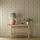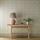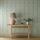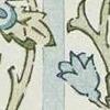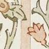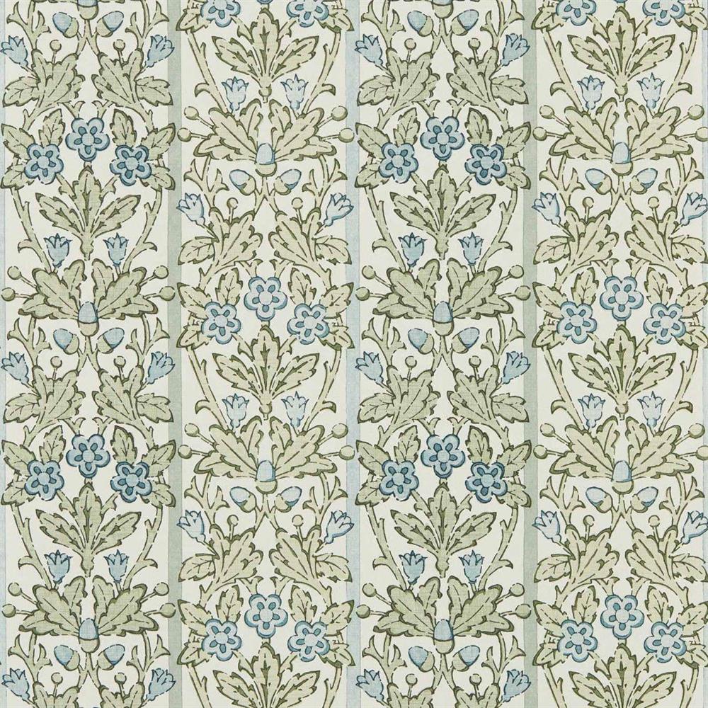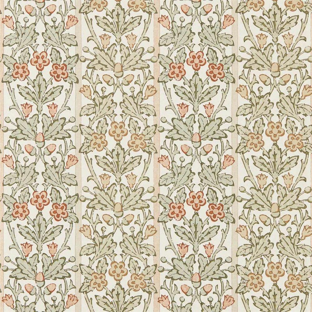 A unique design, Oak & Blossom was initially intended for stained glass, possibly by Duncan Dearle, J.H. Dearle’s son, who worked in stained glass. Refined and repainted, the layout has been transformed while retaining the stained-glass references. A double stripe underlies a graceful arrangement of blossoms, oak leaves, and acorns. A block-printed texture has been added to this otherwise graphic design, and a soft palette complements the striped back look. A digitally printed wallpaper, find a coordinating printed fabric and warp-printed weave in the Handcrafted book.