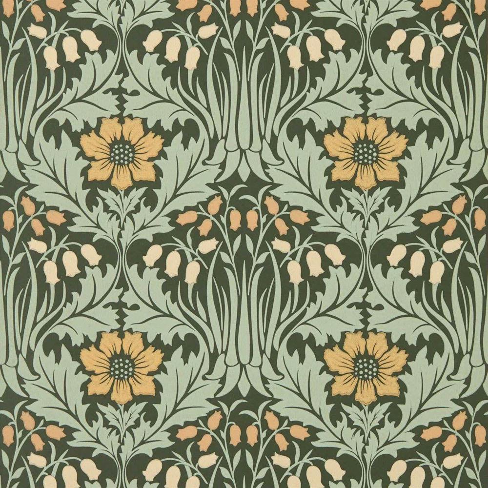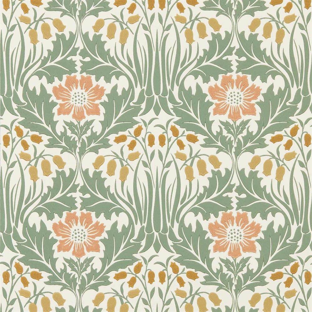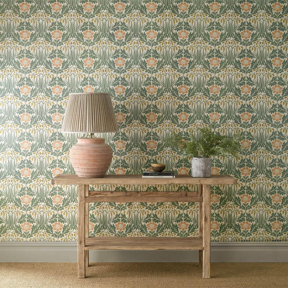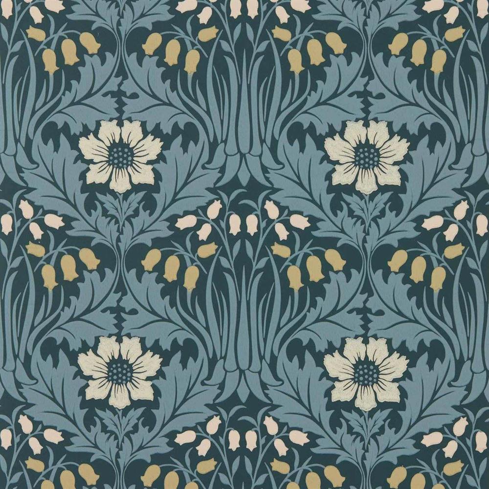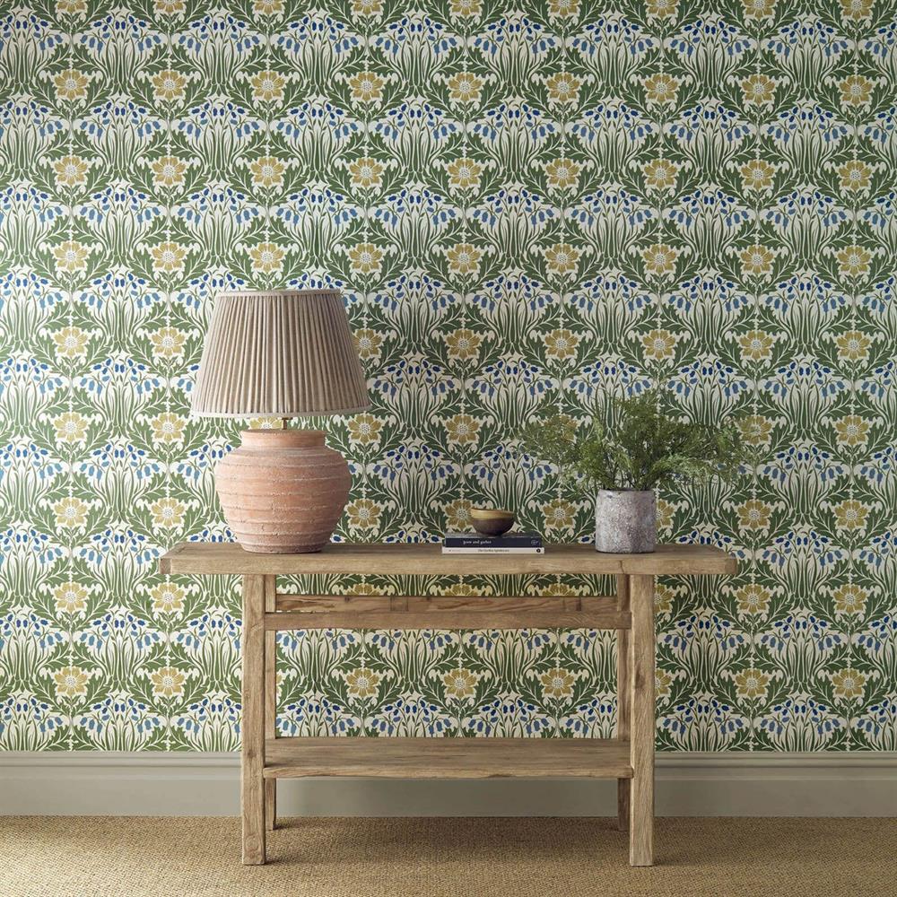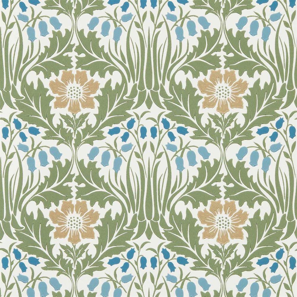 Woodbell & Anemone features a figure-of-eight shape, creating a simple ogee pattern. The document was originally a small sketch consisting of an anemone as the central motif surrounded by bluebells. The pattern has been completed in full colour for surface printing. This technique creates a similar ink mark to an original block-printed wallpaper, producing a lovely reticulation to the final finish.