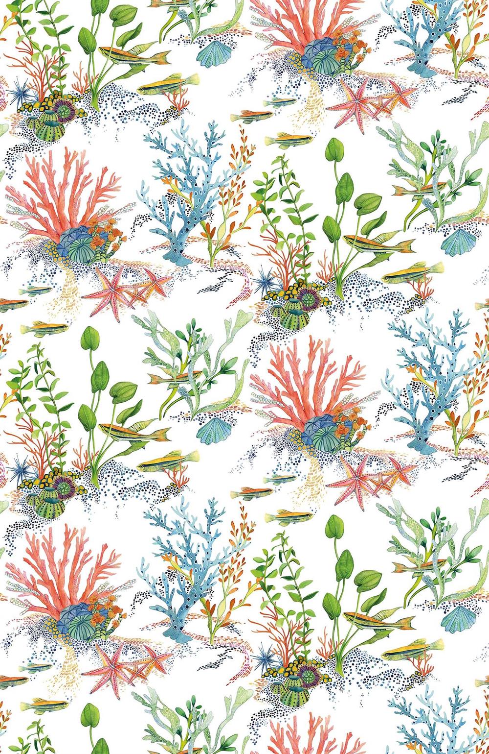 An underwater scene of coral, seaweed, sea anemones, starfish, shells and schools of fish is printed on a shimmering mica ground.