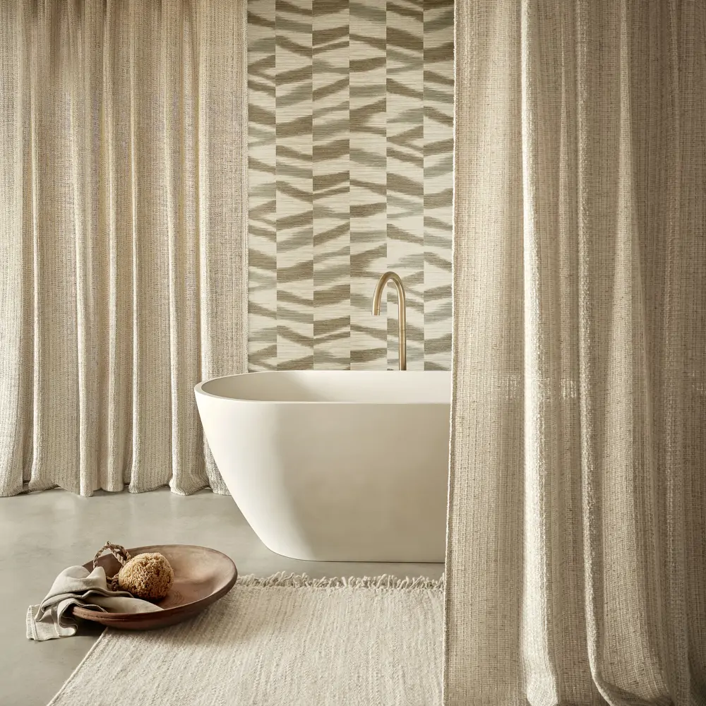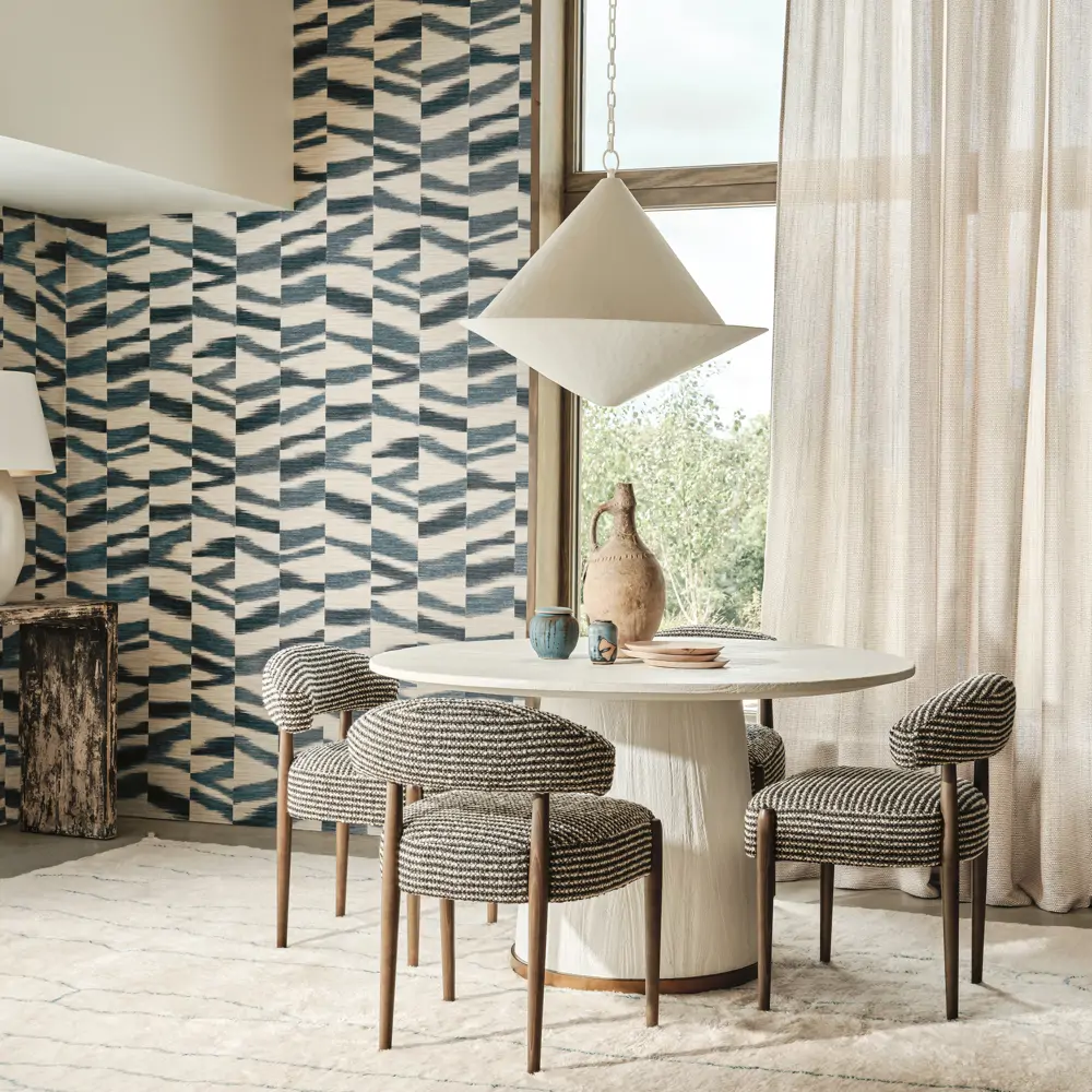 A montage of ikat bands appear to create an abstract design of diffused markings in a play of earthy colour combinations. Creating the natural appearance and texture of seagrass, Manzu is printed on best-selling embossed wallcovering, Esai Seagrass from the Textured Wallcoverings Volume I collection. Esai Seagrass works as the perfect semi-plain coordinate to the Manzu design.