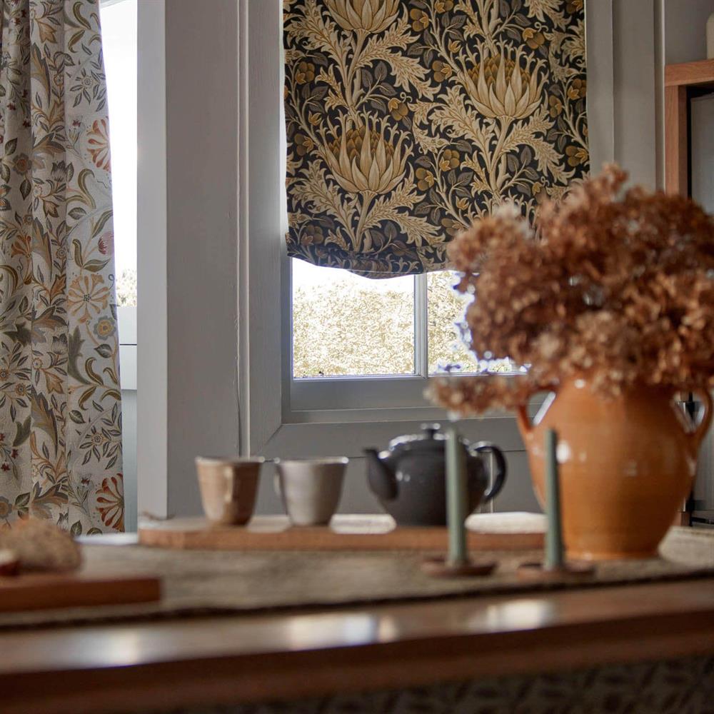 Artichoke Velvet di Morris & Co è un tessuto sontuoso e ornamentale, ispirato al disegno originale del 1898 di John Henry Dearle. Caratterizzato da grandi teste di carciofo stilizzate, il motivo è stampato su velluto di cotone con una ricca palette cromatica che valorizza ogni dettaglio. Il fondo scuro intensifica la vivacità del disegno, conferendo profondità e drammaticità
