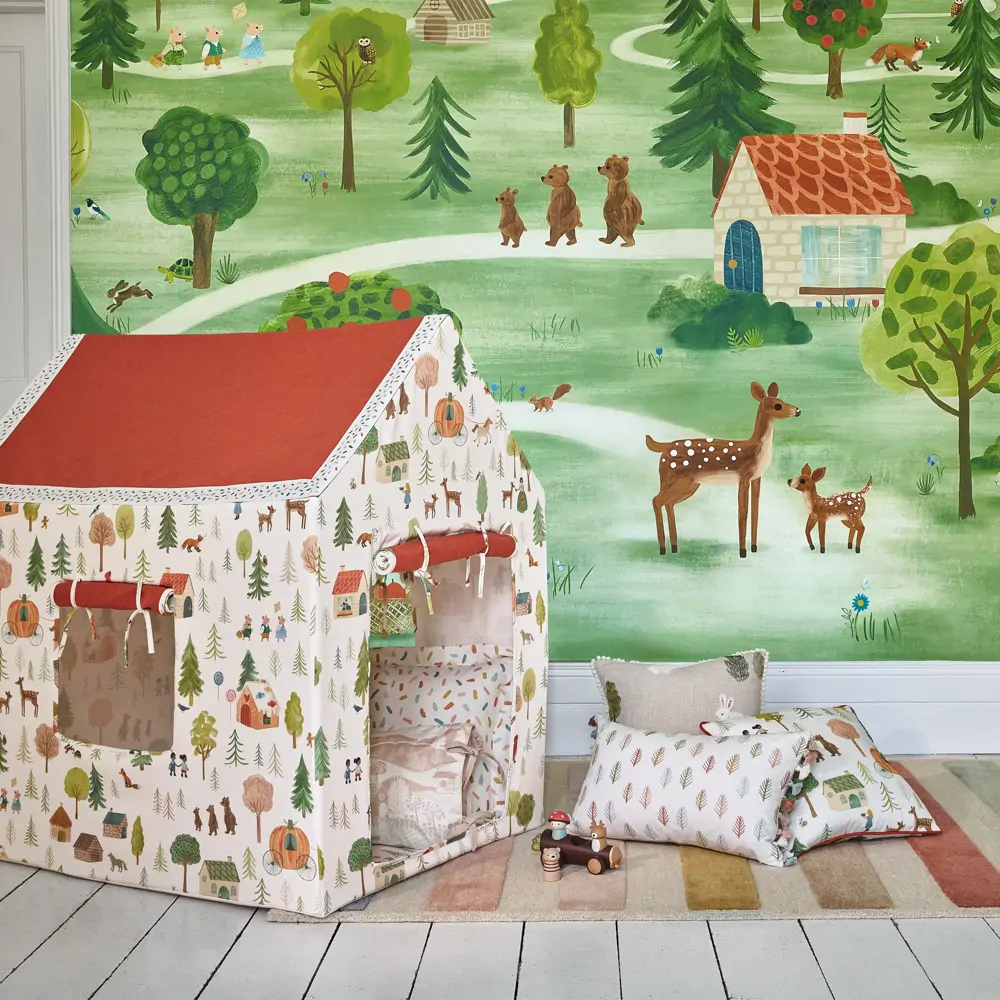 An enchanting fairytale forest printed on soft cotton; the whimsical design invites children to spot their favourite characters, blending fun with imagination.